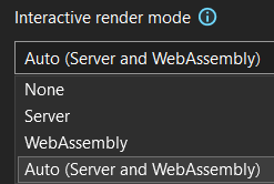 - InteractiveWebAssembly: renders interactively on the client via Blazor WebAssembly hosting with server-side prerendering.