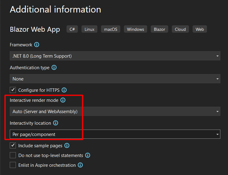 For this example, I selected Auto (Server and WebAssembly) and Per page/component: