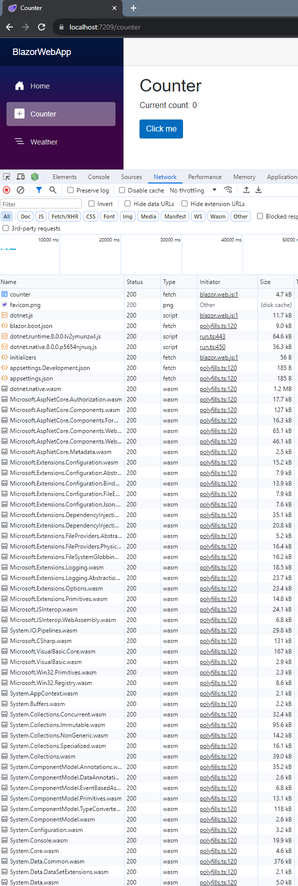 // ...If you run the app, open the Network tab in the browser, and go to the Counter page, you can see that on the first time you access the Counter component, a lot of files are downloaded: