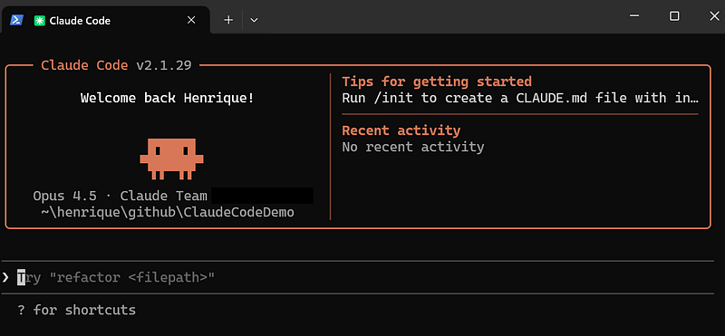 To access Claude Code, navigate to your project directory and type /claude: