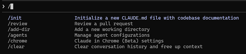 In the Claude Code Terminal is where you can write prompts and ask things to Claude Code. To see the available commands, type / and a list of commands will be shown: