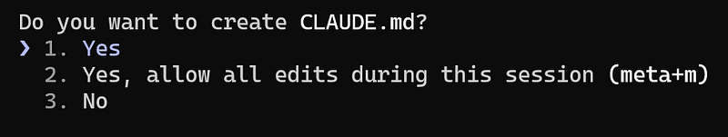 For that, access your repository directory via the command line and run the /init command, and it will ask if you want to create the CLAUDE.md file, select Yes: