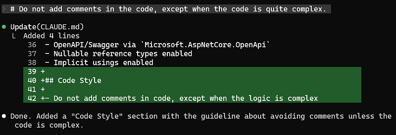 # Do not add comments in the code, except when the code is quite complex.This instruction will be merged into your CLAUDE.md file automatically, and next time you ask something to Claude, the new instruction will already be considered: