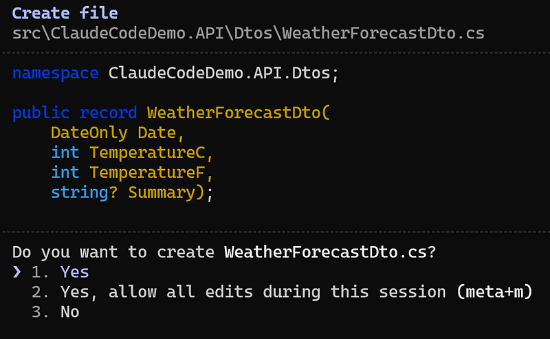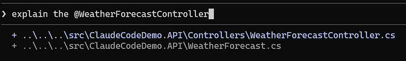 pattern that are used in the @WeatherForecastController@tells Claude to read this specific file#updates theCLAUDE.mdfile to include this guidance, so Claude Code remembers it for future sessions