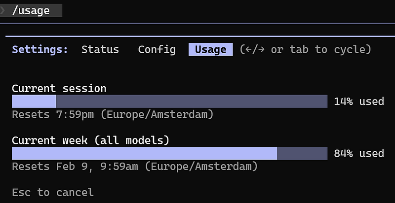 Working with an agentic tool like Claude Code requires an eye on the resource consumption. To check your Claude Code Plan usage limits and session status, type /usage. This command shows how much of your quota has been consumed, how much remains, and details about your active session, helping you monitor costs and avoid interruptions during longer workflows: