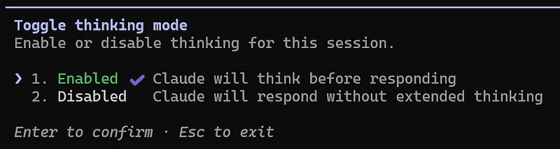 As you move up the scale, Claude is allocated more tokens and processing time to handle higher levels of complexity. To activate thinking mode, press Alt+T (Windows) or Option+T (macOS) and select if you want to enable or disable it: