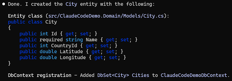Longitude:doubleAnd Claude Code will take care of creating the entity and updating the DbSet for us (or it can also create the DbSet file in case the file does not exist yet):