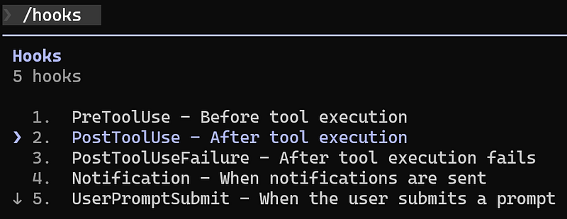 Hooks are user-defined commands/prompts that automatically run at specific points in Claude Code’s lifecycle. For example, we can define a hook to be triggered before or after the code is executed, or when a session starts, etc. To see the full list of Hook Events, check this Claude Code Docs page.