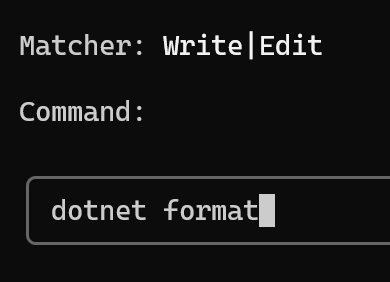 For demonstration purposes, let’s add a hook that formats the code. For that, I selected PostToolUse and will add a new matcher: