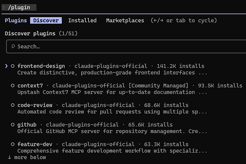 To install a plugin (or add a new marketplace), type /plugin and a list of plugins available in the official Antrophic marketplace will be shown: