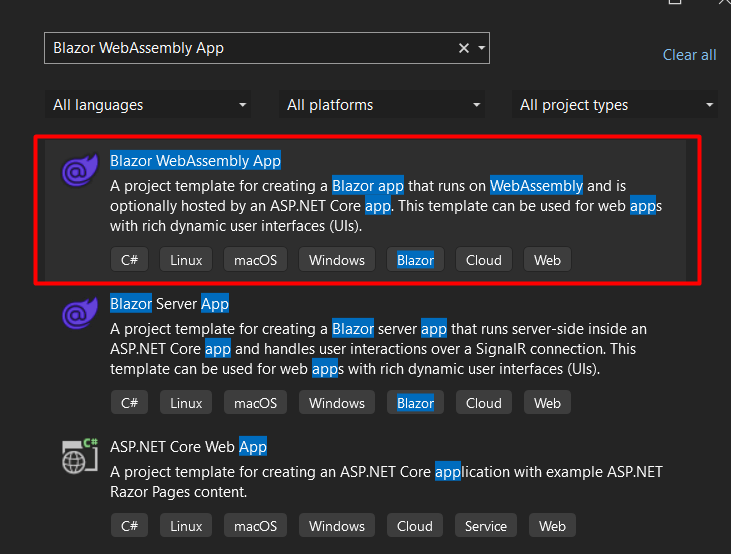 To create a Blazor app with Visual Studio, select the option to create a new project and select “Blazor WebAssembly App”: