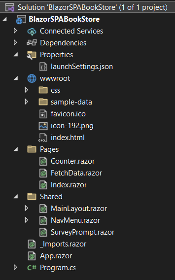The Blazor template provides a working application for us. This is the initial structure of a Blazor WASM app: