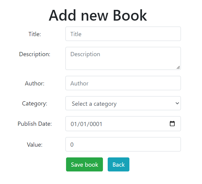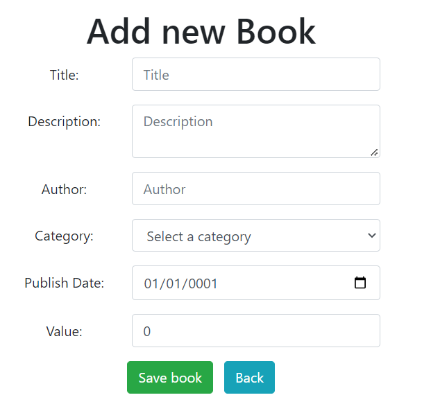The next component we need is the BookEdit.razor component. This component will be used to add a new book and also to edit an existent book. This is how we want to have this component: