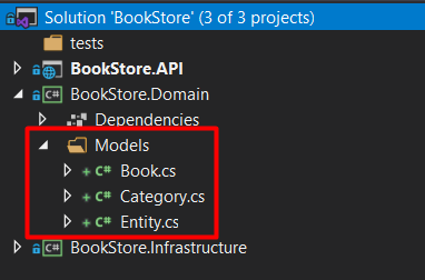 In the Domain project, let’s create the ‘Models’ folder, and also create our entities: Book, Category and Entity classes: