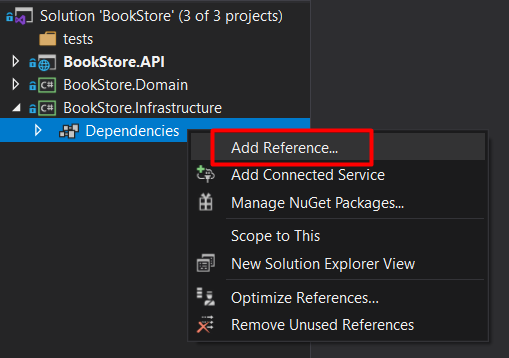 In this project, we need to add a reference to the Domain project. Right click in ‘Dependencies’ and click on the option ‘Add Reference…’: