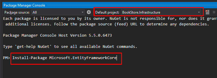 Select the Infrastructure project and let’s install the necessary tools to work with EF Core and migrations: