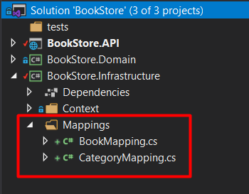 For that let’s create a folder with the name ‘Mappings’, and create the classes BookMapping and CategoryMapping. Those classes must inherit from ‘IEntityTypeConfiguration<T>’: