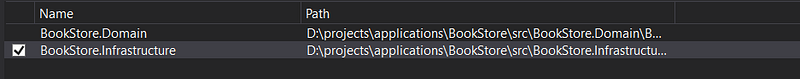 Then you should select the BookStore.Domain project and click in ‘Ok’:
