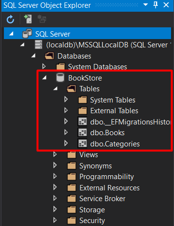 In Visual Studio, you can go to View option and open the SQL Server Object Explorer, and you will see the database with the tables that were create through the migrations: