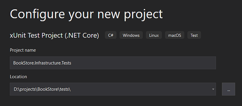 Let’s start creating a new xUnit project for the Infrastructure layer, similar we did on previous articles (you can read how to create a unit test project on this article). The project name will be “BookStore.Infrastructure.Tests”: