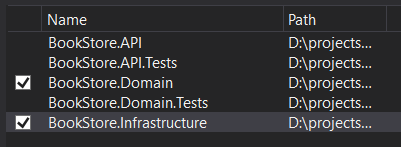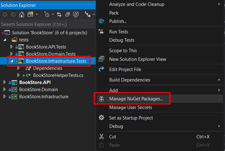 It’s necessary to add in the unit test project, the reference for the Infrastructure layer and to the Domain layer. To do it, right-click on Dependencies (in the unit test project) > click in Add Reference and select the BookStore.Domain and BookStore.Infrastructure: