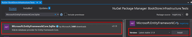 Microsoft.EntityFrameworkCore.InMemory (if you want to use the EF Core In-Memory provider)You can find these packages in the “Manage NuGet packages options”: