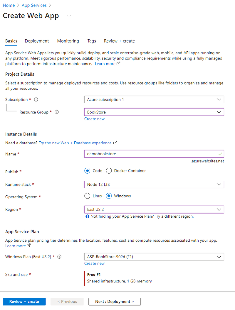 Now it’s necessary to configure your app service, by selecting your subscription, your resource group, informing a name for the service, the tech stack, operating system, region and the plan: