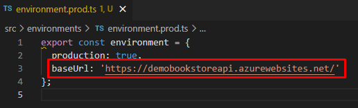 This project uses a back-end application that was already deployed in Azure. So we need to add the URL to the API in the “environment.prod.ts” file: