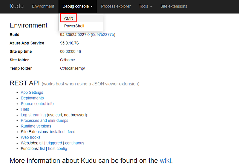 Another page in the browser will open, then click in “Debug console” > CMD: