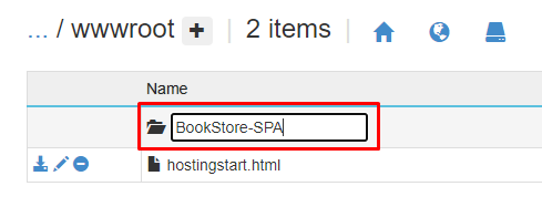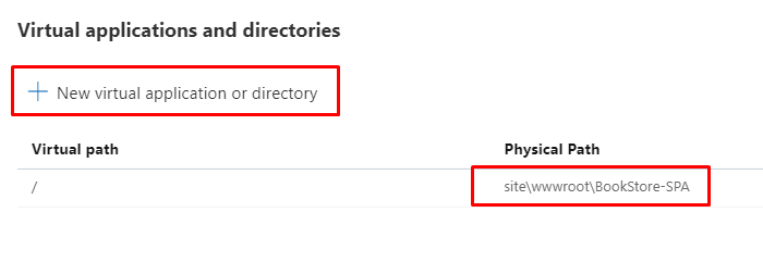 Click in “New virtual application or directory”, and change from “site\wwwroot\ to “site\wwwroot\BookStore-SPA” (or the name of the folder that you created):
