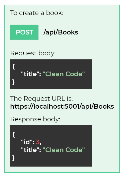 In REST, the URIs are the path to the Resources. To demonstrate some examples, I’m running a Web API locally. In this case, the base URI is: https://localhost:5001/. After the base URI with the address, the object/resource is specified, which in this case is the books, so this is how the URI is: https://localhost:5001/books.