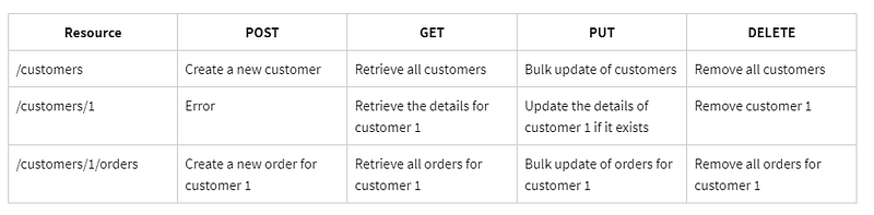 POST /api/books (to create a book)Note that each endpoint contains an HTTP Verb, following by “/api” and “/books”. If we were working with “customer” instead of “book”, it would be: “/api/customers/”. This is a convention. Also for each operation, it is used a specific HTTP VERB (eg.: GET, POST, DELETE, or other). Nouns are preferable when we are working with RESTful APIs. So instead of using verbs in the design of the APIs, we should use nouns. For example, instead of having something like /getBooksand /deleteBook, it will be: /books, and the HTTP Verb will specify which kind of operation will be. In general it will also be pluralized (books instead of book), unless in cases that will handle with a single item, for example book/title, in the case when a single book will be returned.