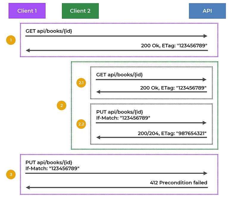3 — After that, Client 1 sends the update with an If-Match header containing “1234567989”, which is the ETag that Client 1 currently has, and what will happen now is that it will reach the API, and the API will check that this ETag does not match with the most current ETag for that resource, so the API will return a 412 Precondition failed, and the update from Client 1 will not be applied because he was working on an older version of the book (he should first get a fresh copy of the book to work on).