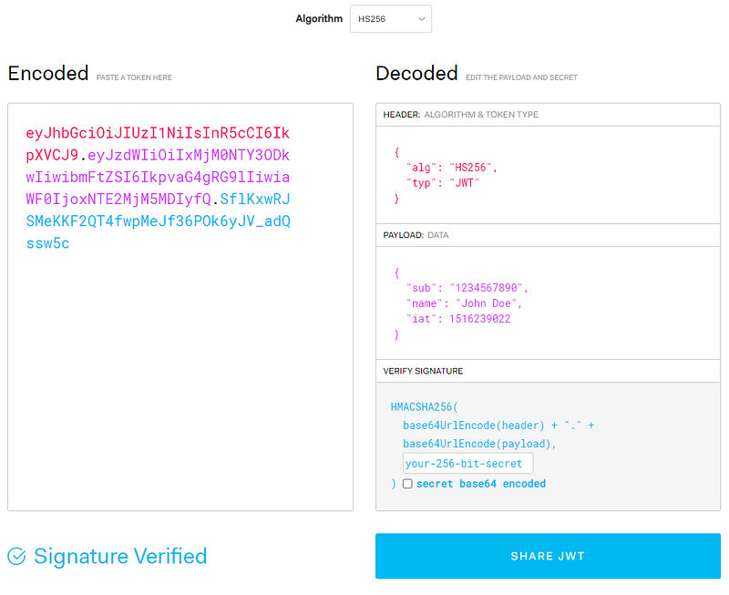The purple part of the token is about the data of this token. On the right side of the picture, in the “Payload”, there are the properties “sub”, “name’ and “iat”, these information are encrypted on this token using the algorithm HS256.