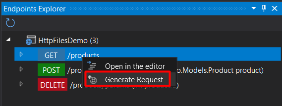 On the Endpoins Explorer, you can see all the endpoints you have in your app, and right-click and click on “Generate request” (if your new endpoint is not visible on this window, click on the refresh button):