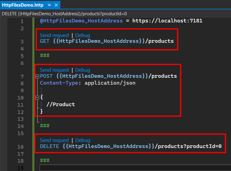 @defines a variable. For example, the@HttpFilesDemo_HostAddressis a variable that contains the host address URL. - The variables can be referenced in requests, by wrapping their names in double curly braces (see the line where there is the GET request).