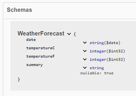 You can also see the Schemas used by the API, which represent the structure of the data that the API interacts with:
