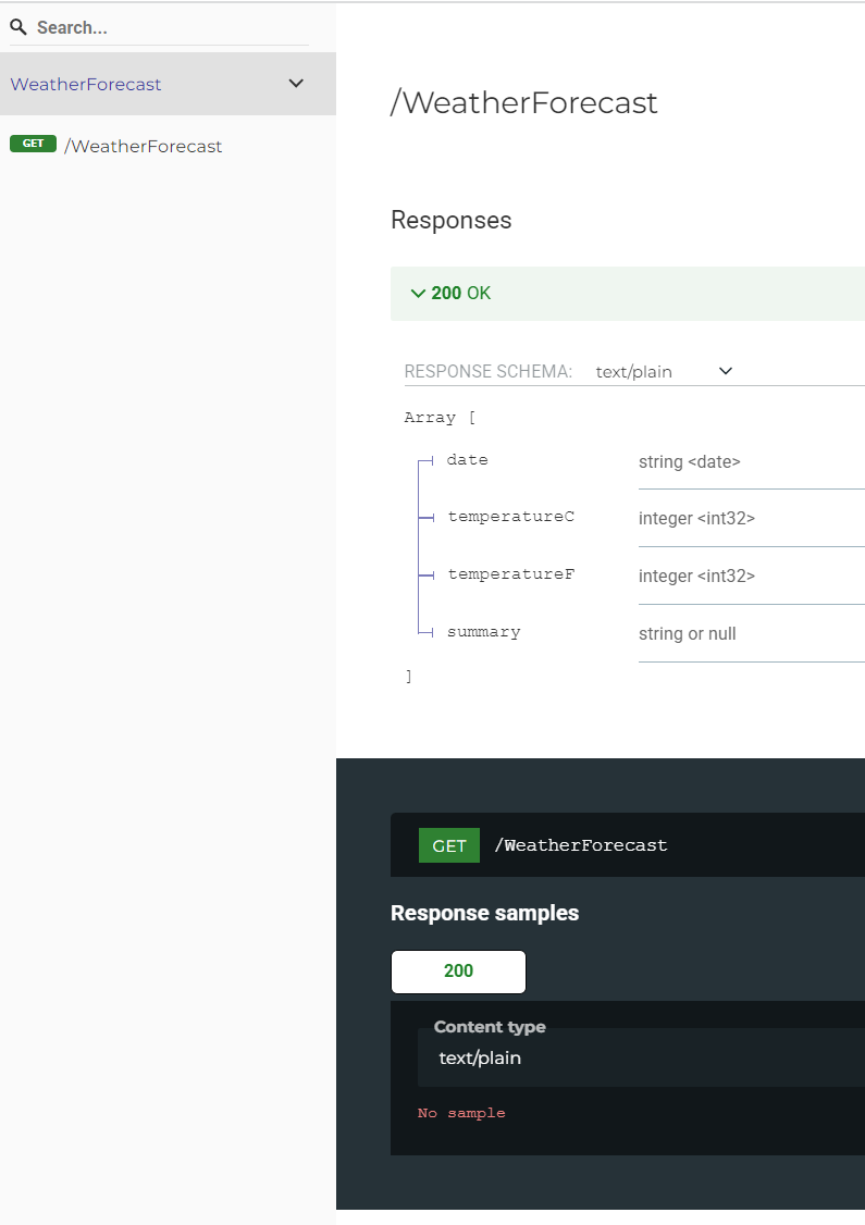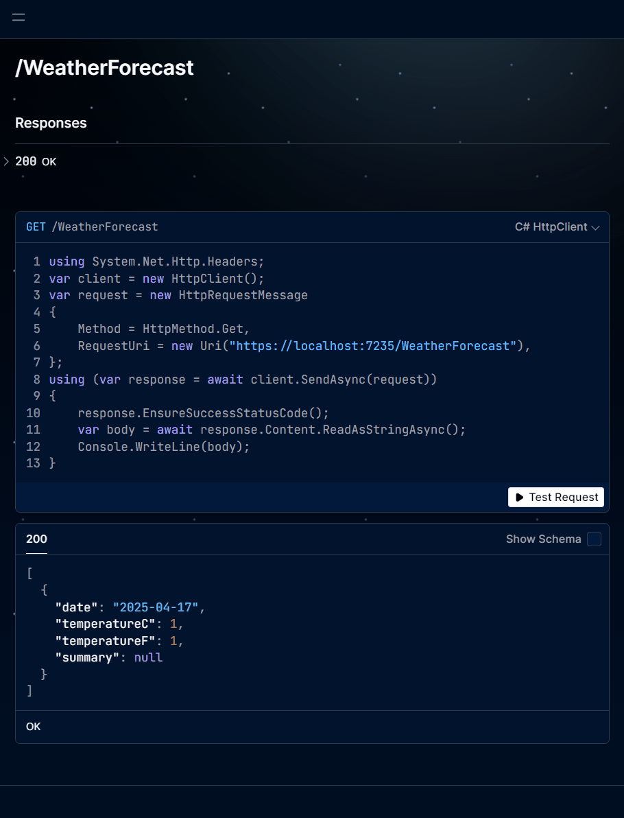 // Or use only this line for default config: app.MapScalarApiReference();Run your app and open your app URL in the browser, and add /scalar at the end of the URL. Then click on the endpoint (in this example the GET /WeatherForecast), and click on Send, and you will see the response:
