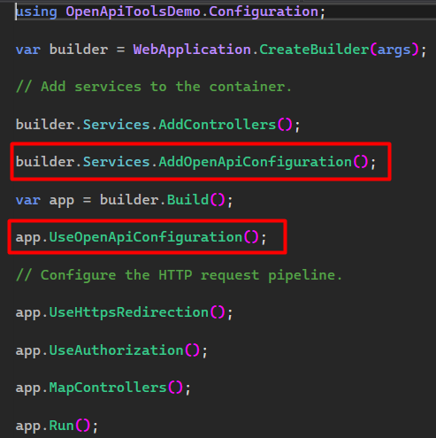 dotnet add package Microsoft.AspNetCore.OpenApi --version 9.0.4Then in the Program.cs file, add the following lines: