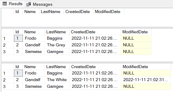 Gandalf The Greywas updated toGandalf the White, because the Primary Key Id 2 already existed in the database and also exists in the@Personsvariable. You can confirm that by checking the values in theCreatedDatecolumn andModifiedDatecolumns, it kept the sameCreateDatebut included the date and time that the record was updated (ModifiedDatecolumn). - And the records