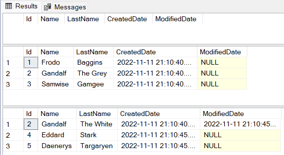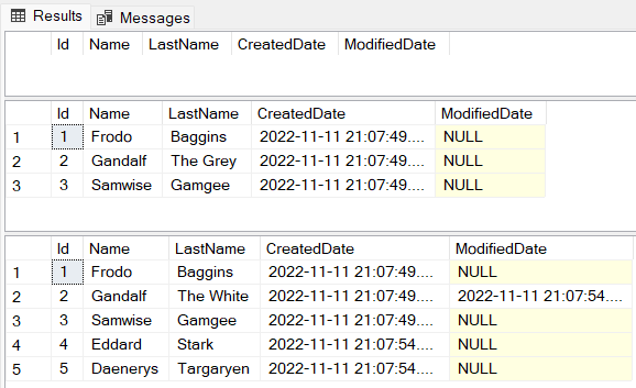 Frodo BagginsandSamwise Gamggealready existed in the database, so nothing was changed for these two records. You can confirm that by checking the values in theCreatedDatecolumn (which has the time of the creation of the records) and theModifiedDatecolumn is null — which means that the records were not updated).- The record for