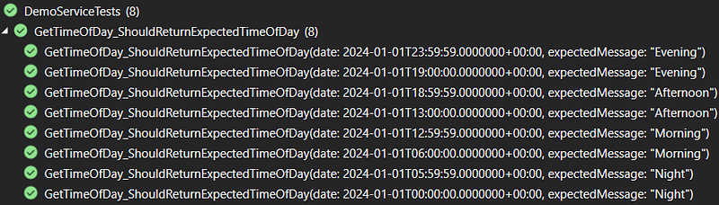 _timeProviderMock.Setup(c => c.GetUtcNow()).Returns(expectedDate);For example, in the code below you can see a unit test class that tests the GetTimeOfDay method. For this method, there are test cases for the four periods of the day: