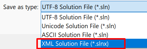 And in the “Save as type” select “XML Solution File (*.slnx)” and save it: